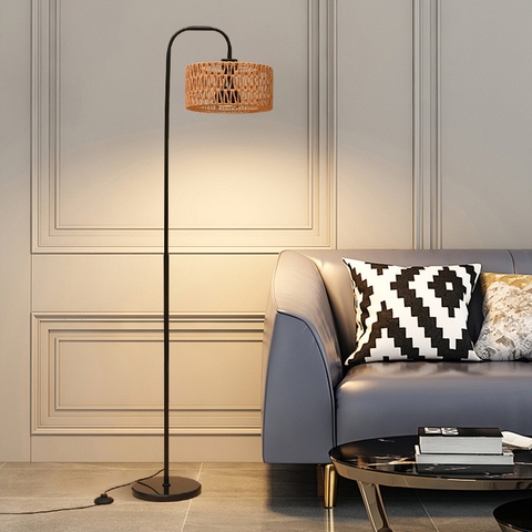 등나무 갓 9W 전구 및 발 스위치가 있는 보헤미안 아크 플로어 램프, 거실, 침실, 사무실용 보헤미안 스탠딩 라이트