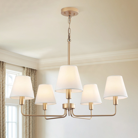 흰색 패브릭 음영이있는 골동품 황동 5-라이트 샹들리에 식당 주방 출입구를위한 조정 가능한 선형 섬 조명